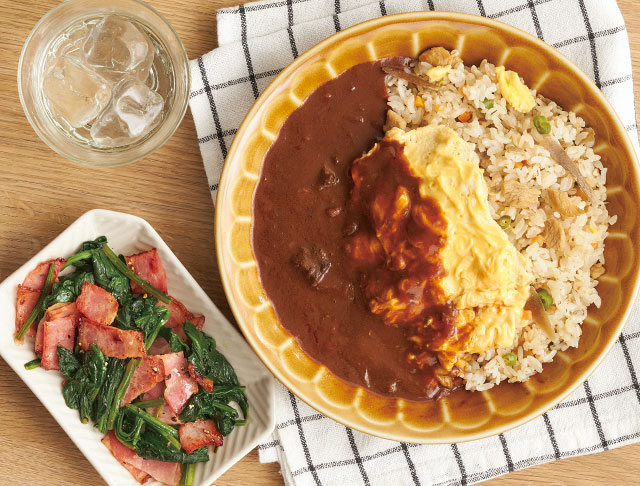 ごぼうピラフのカレーオムライス、スモークベーコンとほうれん草のソテーeフレンズ ぱくぱく献立くん。