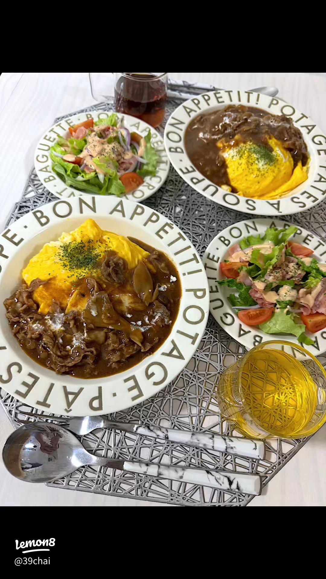 👈料理初心者でも作れる簡単献立 . リールに載せたオムハヤシの静止画&副菜レシピです。 半熟卵があると一気に豪華になりますよね🤤フライパンをしっかり温めた後にバターたっぷり溶かして卵液を一気に注ぐ&早めに火を止めて余熱調理が半熟卵になるコツです! 副菜も。