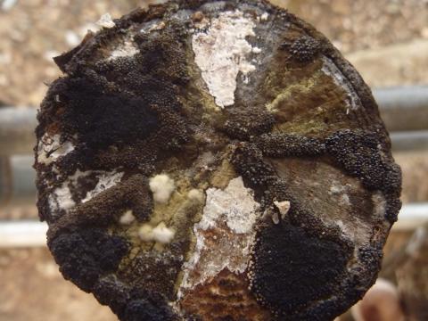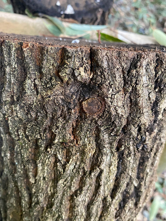 この原木に出来た黒いツブツブは、しいたけの雑菌「クロコブ菌」と言います。 クロコブ菌は乾いた原木に発生しやすく、はじめはウグイス色をしています。それが木の中に蔓延し、子実体 キノコの状態 になったものが、この黒いツブツブです。硬いので当然食べられません。