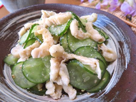 さっぱりおつまみ♪ 鶏皮ときゅうりの生姜つゆ酢和え花ぴーのあてレシピ。