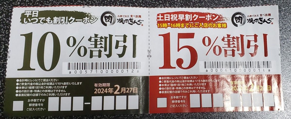 焼肉きんぐ 土日祝早割15%クーポンYahoo!フリマ 旧PayPayフリマ。