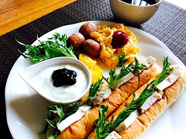 日曜日の朝ごはん スナックパンに鶏ハムサンド野菜サラダスクランブルエッグウインナーブルーベリーヨーグルトコーヒースナックパンサンド いちごSnapdish スナップディッシュID:Sqinqa。