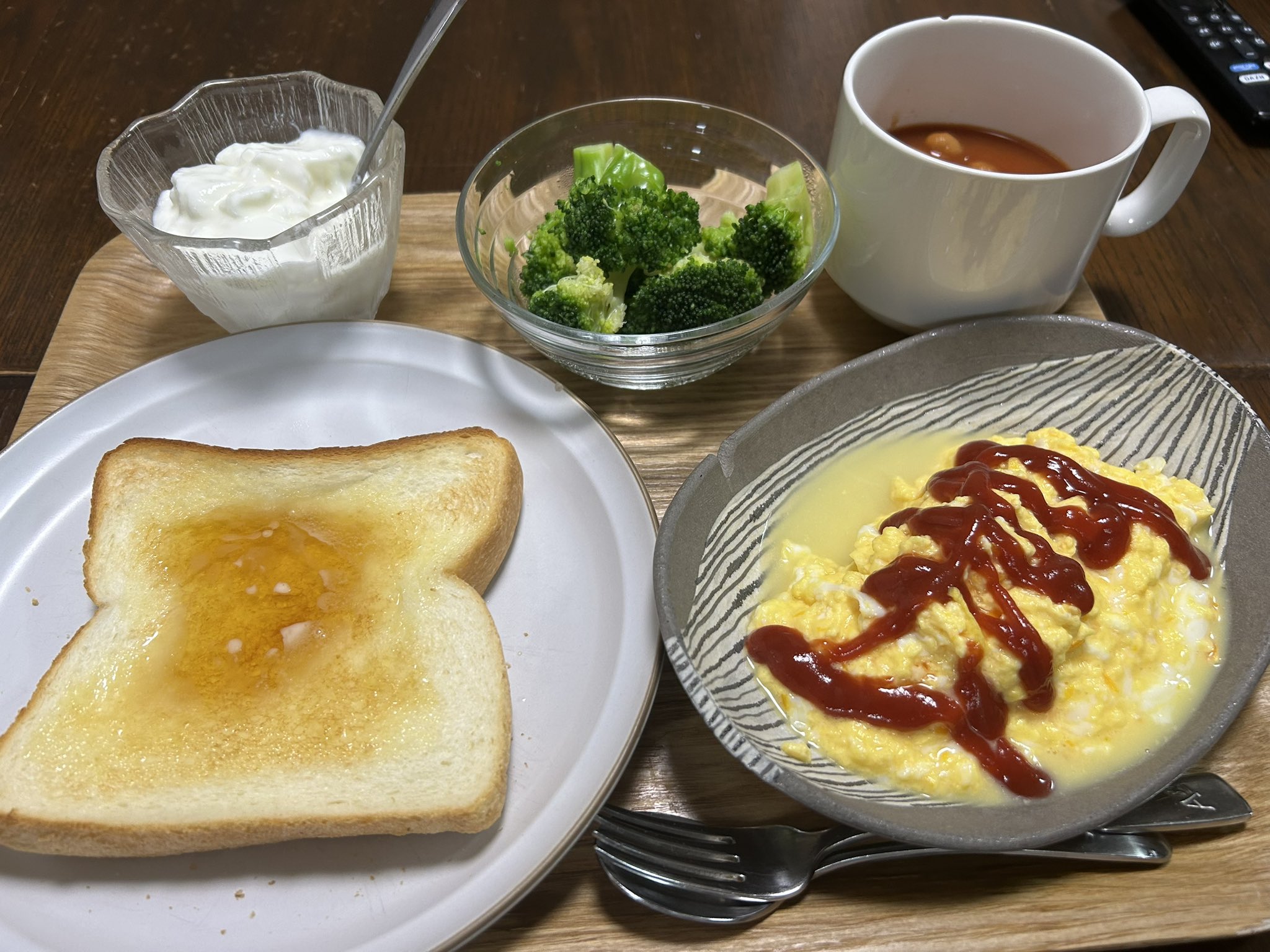 ticoruzel on X: "今朝のゆっくり朝食 ハニートースト スクランブルエッグ ヨーグルト 茹でブロッコリー ミネストローネŧ‹"ŧ‹" *´ч`* ŧ‹"ŧ‹" 玉子に牛乳入れすぎましたな https:t.co op3VnLeZee"X。