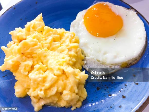 朝食 スクランブルエッグ ヨーグルトとミディアム ブルーの皿の上に置かれた卵の目玉焼き - スクランブルエッグのストックフォトや画像を多数ご用意 -スクランブルエッグ, 玉子, 皿 - iStock。