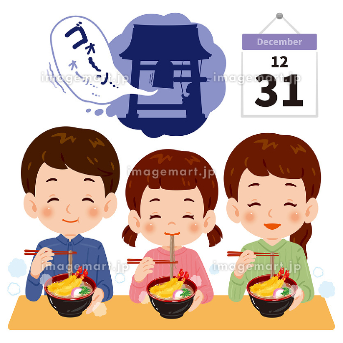 年越し蕎麦を食べる家族と除夜の鐘のイラスト素材235215245 毎月1点無料 フリー のストックフォト イメージマート。