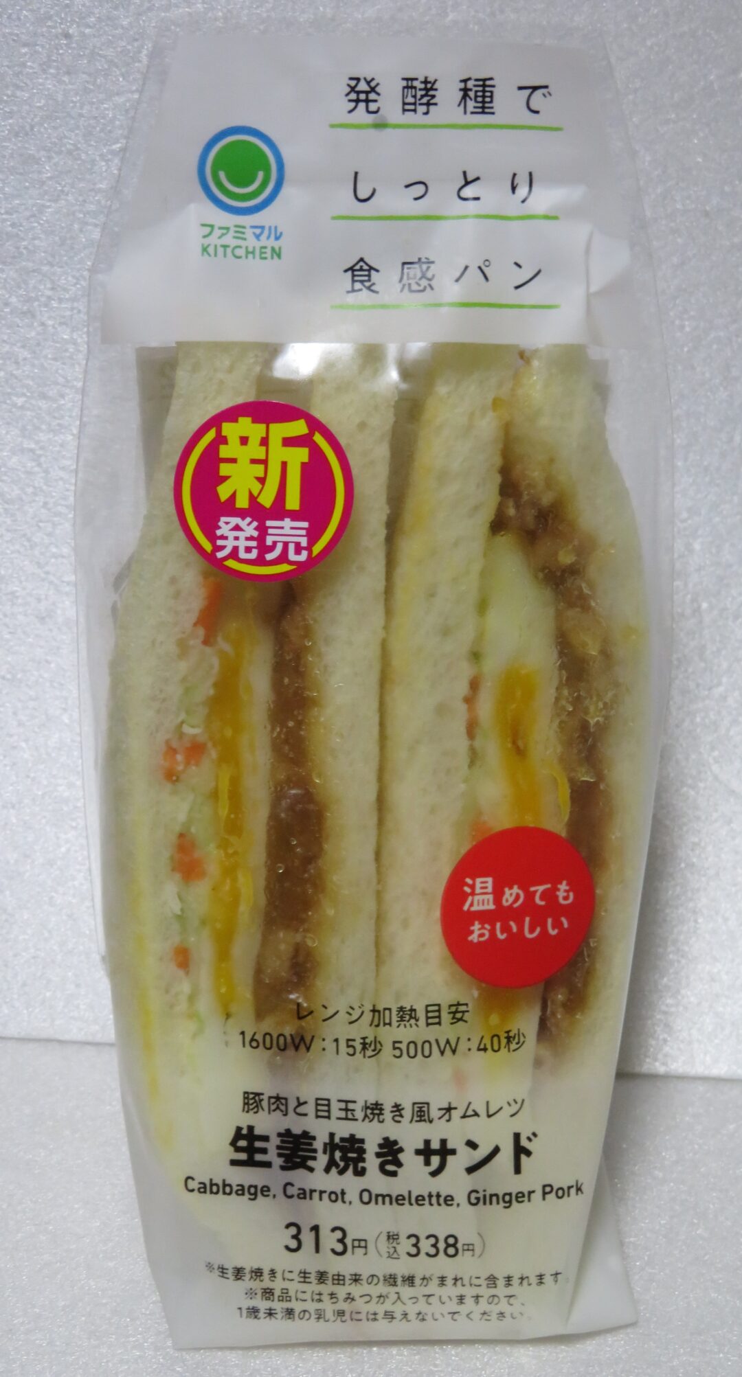 食レポ ファミマ限定の生姜サンドイッチ『生姜焼きサンド』を実食!「生姜焼き」「目玉焼きオムレツ」「キャベツ」「人参のマヨソース和え」をサンドした ファミリーマート限定のサンドイッチ コンビニ感想新作ポテトチップス研究所。