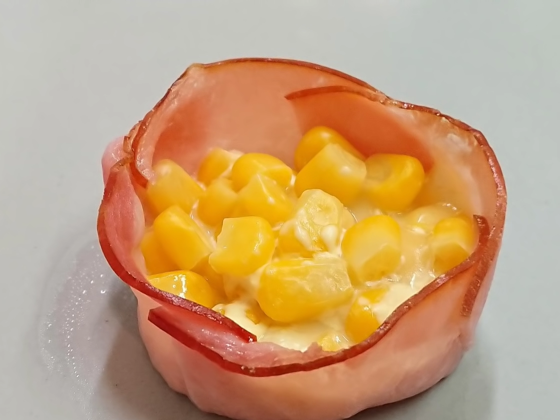 詳しいレシピはこちら↓ ・コーンマヨソース材料 2人前 コーン缶:1缶 マヨネーズ:大さじ6 醤油:大さじ1 粉チーズ:大さじ1作り方①コーン缶の水をよくきる ②調味料とコーンをよく混ぜたら完成! ・ハムコーンカップ材料 2人前 ロースハム:6枚 コーンマヨソース:大さじ6チーズ:適量作り方①ロースハムに切れ込みを入れる ※ハムは切り離さないでくっついた状態にする。