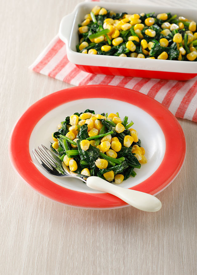 お弁当おかずに!ほうれん草とコーンの塩こんぶバター炒め。