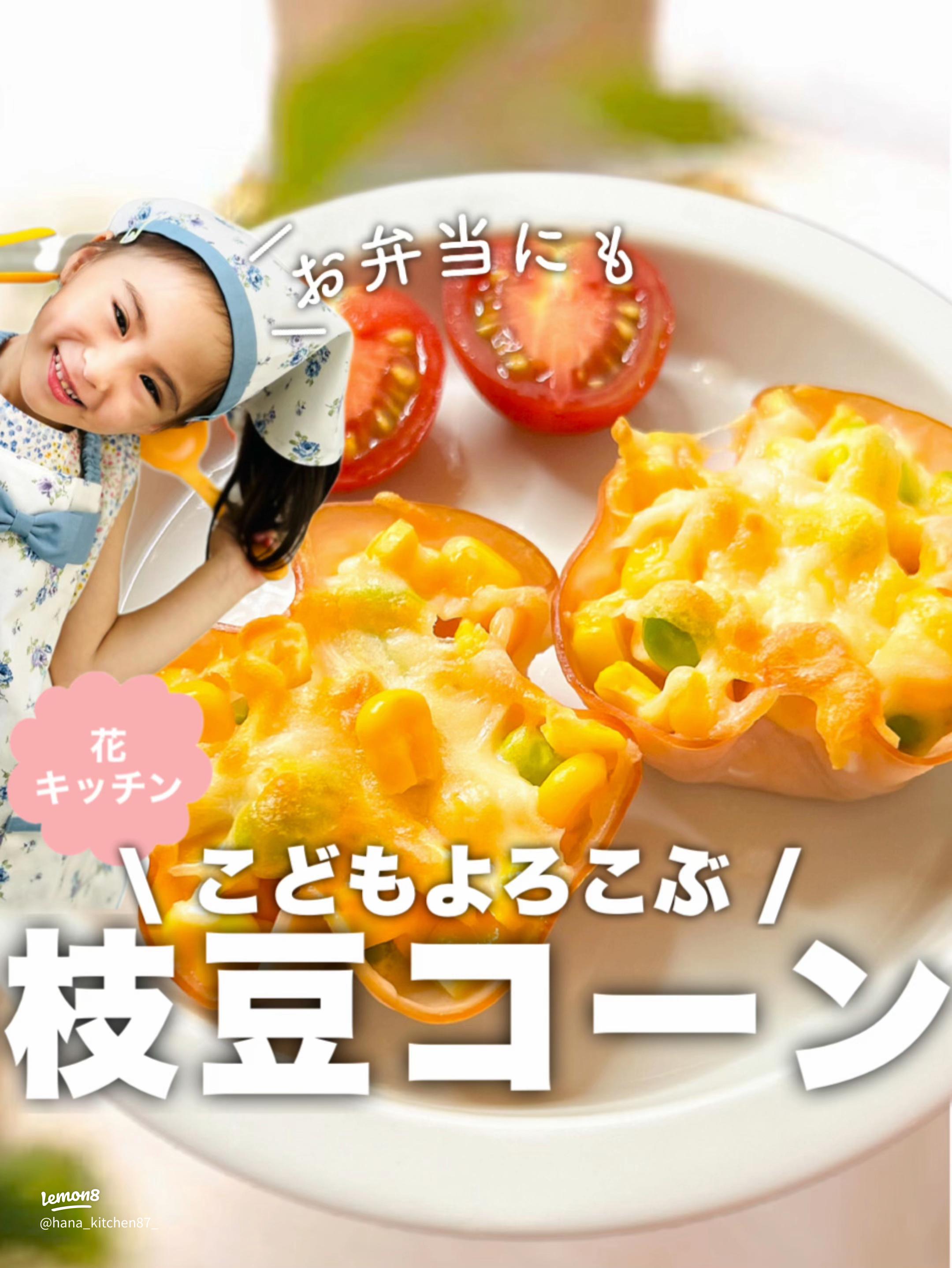 5歳が作る可愛い枝豆コーン♡ハムカップのレシピ。