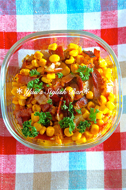 とうもろこしとベーコンのバター醤油和えお弁当お弁当おかず簡単レシピ時短レンチン電子レンジおかずレシピ2210:のんびり毎日 日々の暮らしの食卓 いただきますのレシピ 時々 編み物。