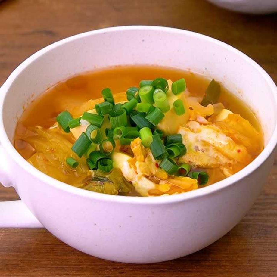レンジで簡単ピリッと美味しいキムチと豆腐のスープ。