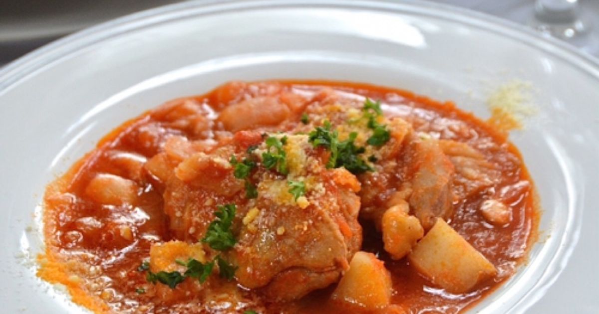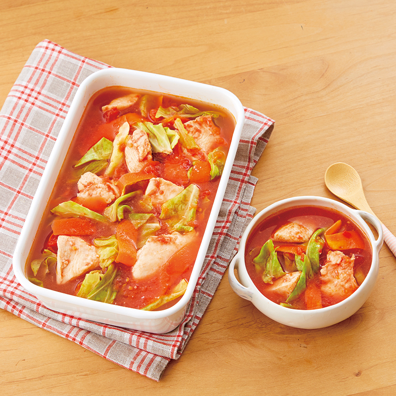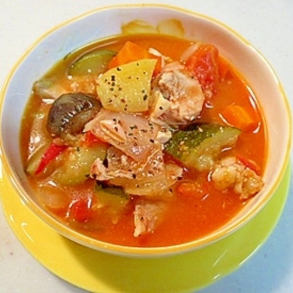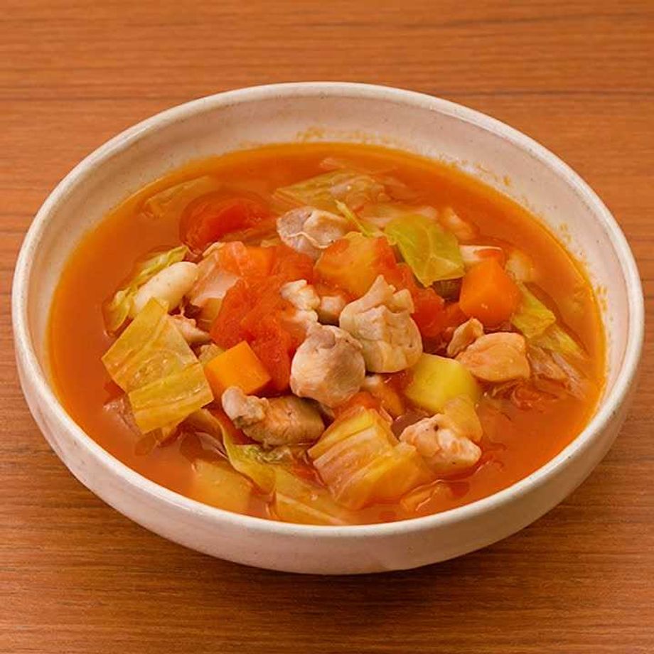 鶏もも肉と角切り野菜のミネストローネ風煮込み 人気のヘルシーメニュー。