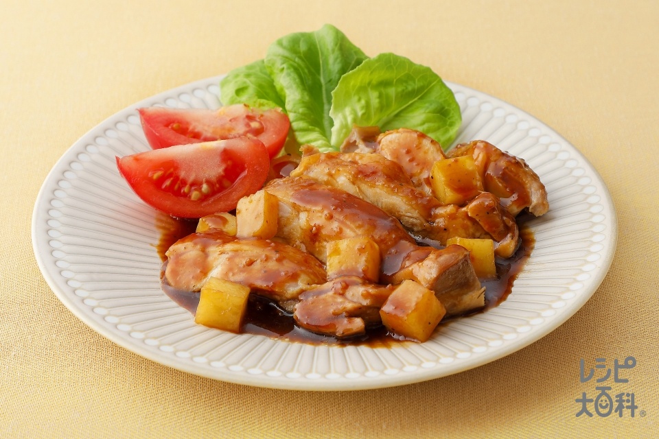 鶏とじゃがいものガーリックオニオン味の献立 副菜:なすとみょうがの浅漬け、汁物:和風ミネストローネ献立・メニュー 味の素パーク たべる楽しさを、もっと。