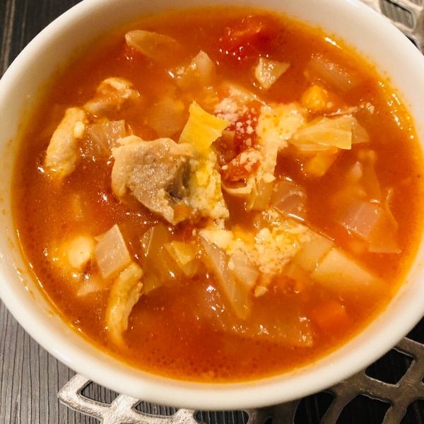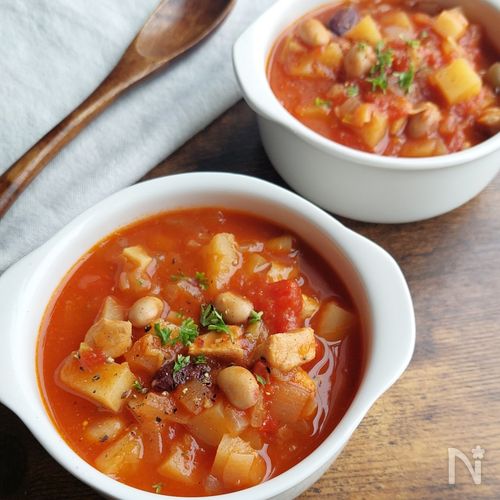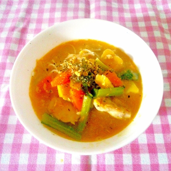 「鶏ムネのとりこ」の和風ミネストローネ。
