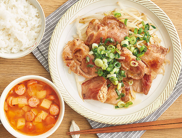 豚バラほうれん草の献立 副菜:ナイスリメイク!ガリバタ鶏☆ペンネボウル、汁物:和風ミネストローネ献立・メニュー 味の素パーク たべる楽しさを、もっと。