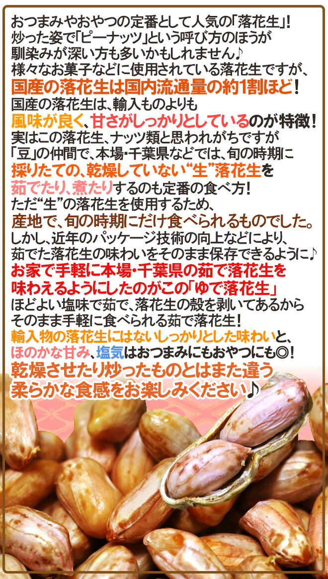 今だけの旬の味生落花生!, 生のままでは食べられないのでゆでるか炒って食べましょう!,生落花生のゆで方 ,①ゆでる場合、土などの汚れをしっかり落とす。, ②たっぷりのお湯を沸かし、約3%の塩と殻つきの落花生を入れる。,③中火で40分ほどゆでましょう。浮いてくるので、落し蓋をすること。, ※大きさによって火が通る時間が変わるので、,味見をしながらちょうどよい固さまでゆでるのがポイント。,。