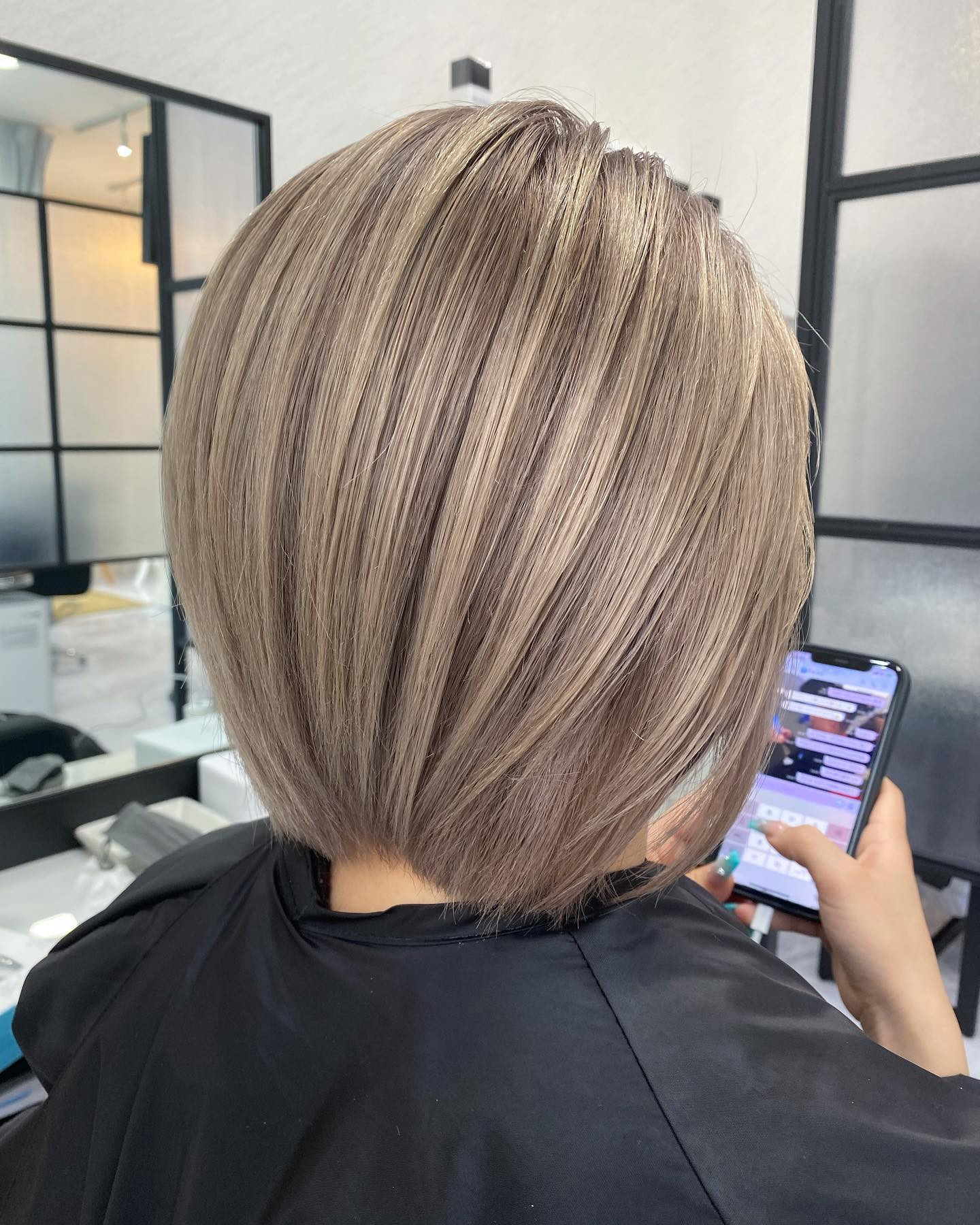 ミルクティーグレージュにパープルを入れたハイセンスなボブシルバーカラー美的.com。