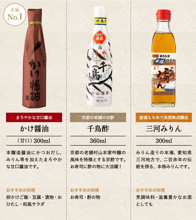 蔵元のこだわり調味料セット三河みりん 万能味だし 千鳥酢 醤油 味噌 他全6点送料無料 - 足立醸造 公式オンラインストア木桶仕込みの国産有機 醤油・味噌を播州からお届け。