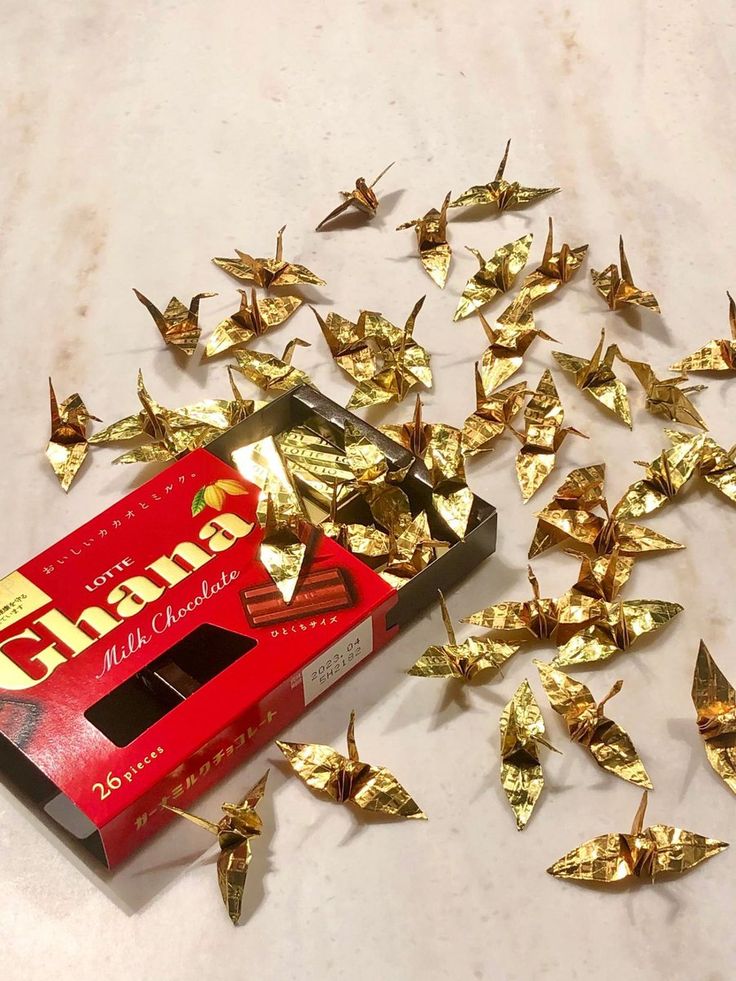 ガーナチョコ「ガーナで自由研究第二段! 『2日間で食べたガーナエクセレントの包み紙折り鶴にしてみた。』 結果は4 22 08 15。