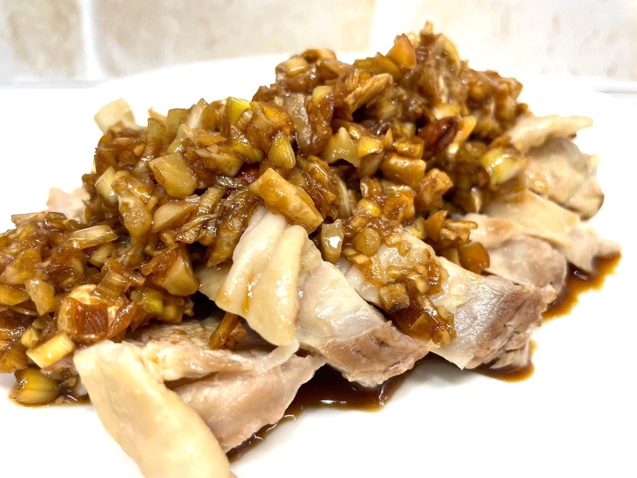 ●蒸し鶏のタマネギ梅しょうゆソース。