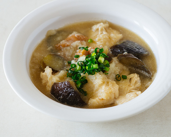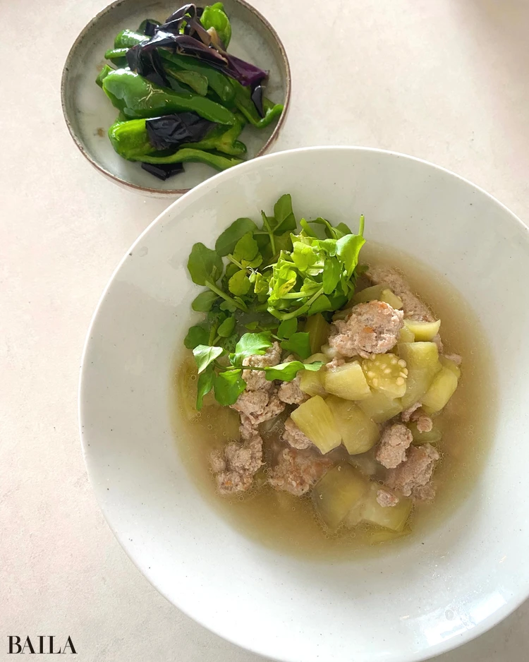 長谷川あかりのご自愛ごはん vol.40 夏の体に染みわたる養生レシピ「茄子のサルシッチャ風スープ」@BAILA。