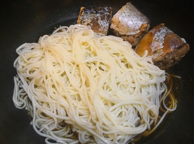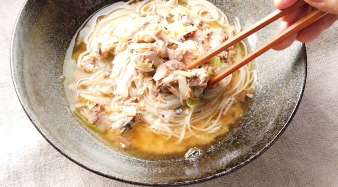 「土曜はナニする」豆腐そうめんのサバ缶担々麺。