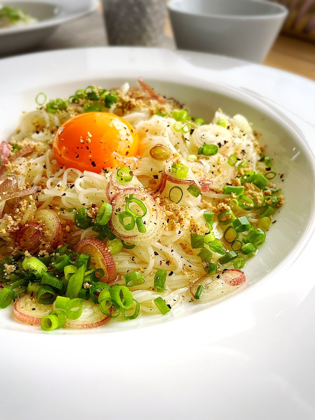 リュウジ@料理のおじさんバズレシピ on X: "そうめんがガンガン吸える必殺ズボラ飯! 「わさびバター釜玉そうめん」 固めに茹でたそうめん100gに卵一個、バター10g、三倍希釈めんつゆ大さじ2弱、わさび、小ネギ、あれば鰹節かけるだけ!!よく混ぜてお召し上がりください。