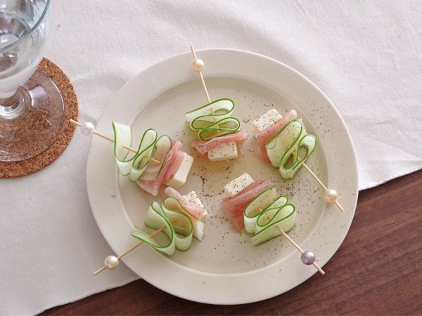ピンチョス~生ハムとチーズのきゅうりリボン~。
