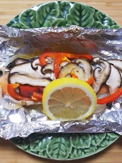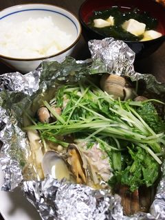 ハマグリと高野豆腐と三つ葉のホイル焼き。