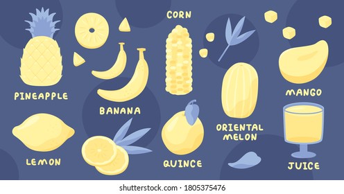黄色い果物と野菜のコレクション。 パイナップル、レモン、バナナ、コーン、カンヌ、メロン、マンゴー、ジュース。」のベクター画像素材 ロイヤリティフリー1805375476Shutterstock。