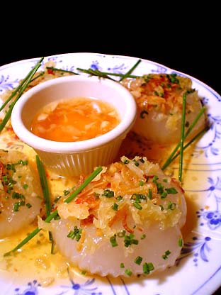 最近出したルノワールコースの魚料理です。 お皿の上の材料を全部愛知県産でまとめてみました。 イトヨリ グリーンアスパラ ブロッコリーピュレロックチャイブ シブレットの花 甲殻類のジュ シブレットのネギ坊主は美しい紫色なんですよ~。 食べるとキチンとネギの味が。