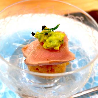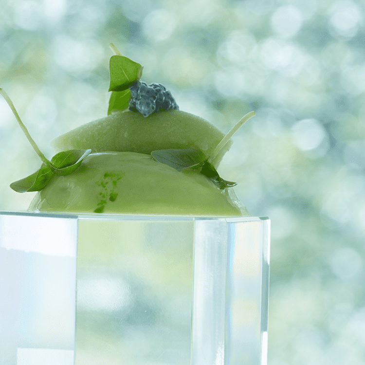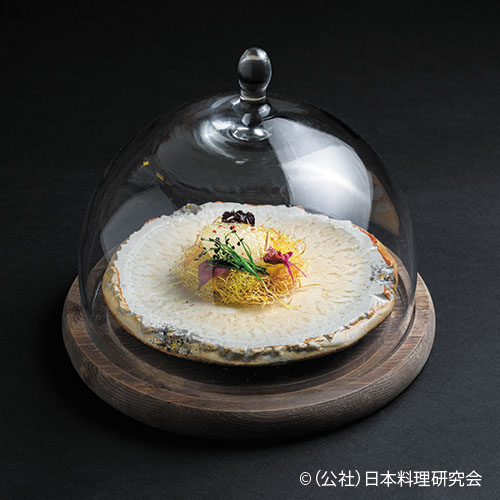帆立、オリーブオイル、ロックチャイブ、アマランサス、ピンクペッパー、紫蘇パープル、オレンジ果汁、酢橘果汁、大豆レシチン、巣籠野菜日本料理研究会レシピる。