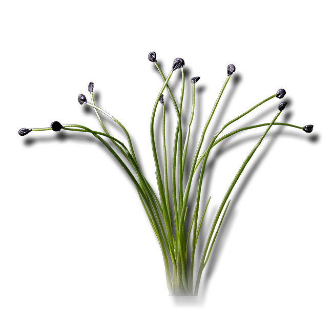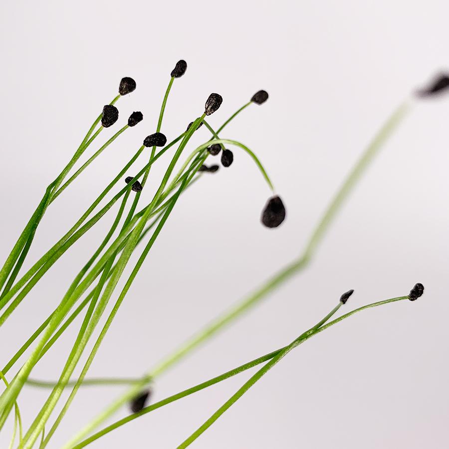ロックチャイブ 」は、スタイリッシュな容姿と、ほのかなガーリックの風味が特徴です。先端にある黒い帽子はシードポットと言って、タネの外皮で、加熱するとクリスピーな食感を楽しむことができます。 ロックチャイブは野菜をはじめ魚や肉料理によく合い、村上農園マイクロ。