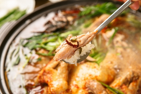 鍋にチャイブを入れたスパイシーなロックフィッシュスープ、おたま付きの写真素材・画像素材 Image 117509696。