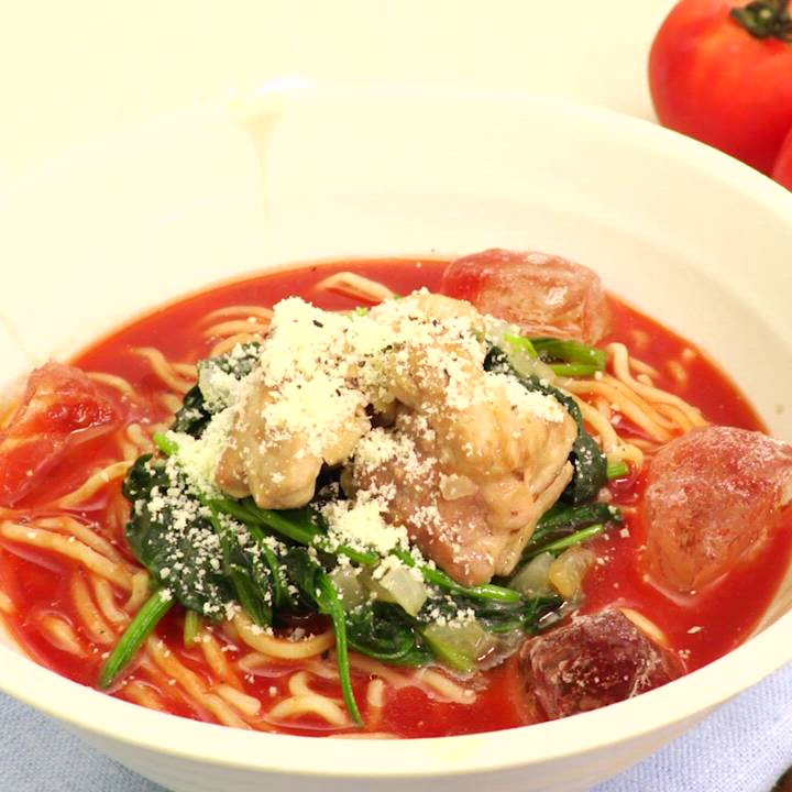 インスタントラーメンアレンジ トマトジュースで超簡単チキンラーメンマルゲリータの作り方!~矢端みゆアナとすーさんも~ - YouTube。