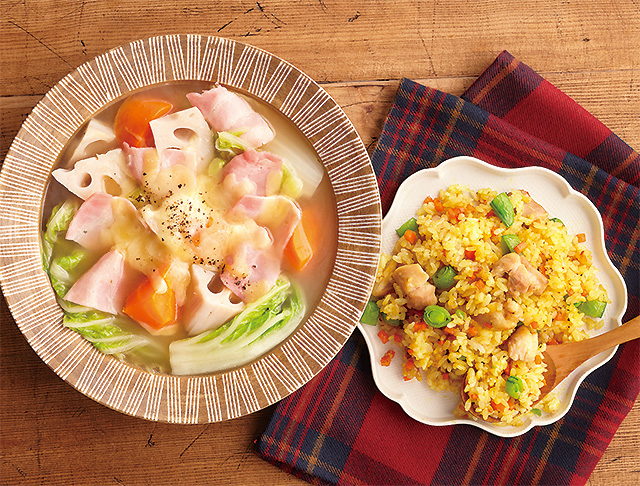 冬野菜のとろ~りポトフ風、チキンのカレーピラフeフレンズ ぱくぱく献立くん。