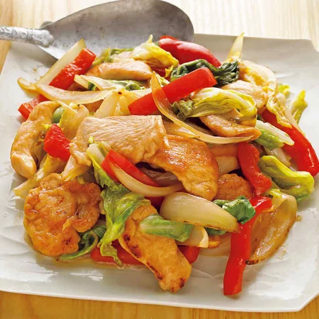 カラーピーマンと鶏肉の中華炒めJA宮崎経済連。