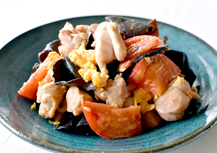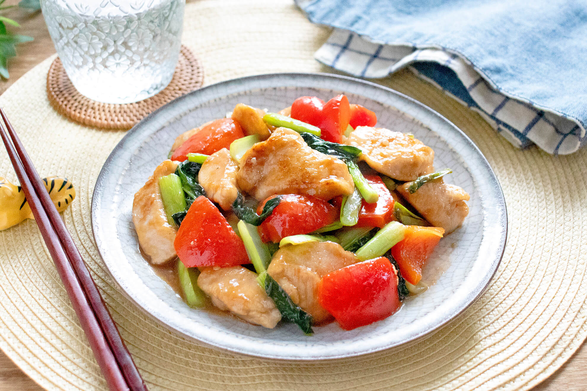 簡単鶏肉おつまみレシピ~鶏モモ肉のトマトとオクラの中華炒め。