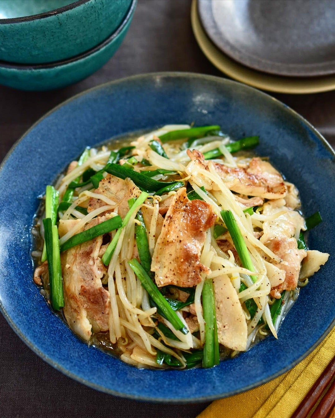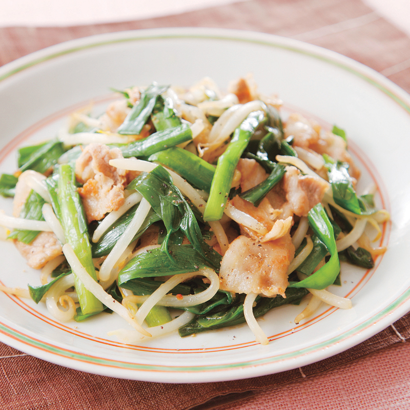 豚ニラもやしのにんにく塩麹炒め。