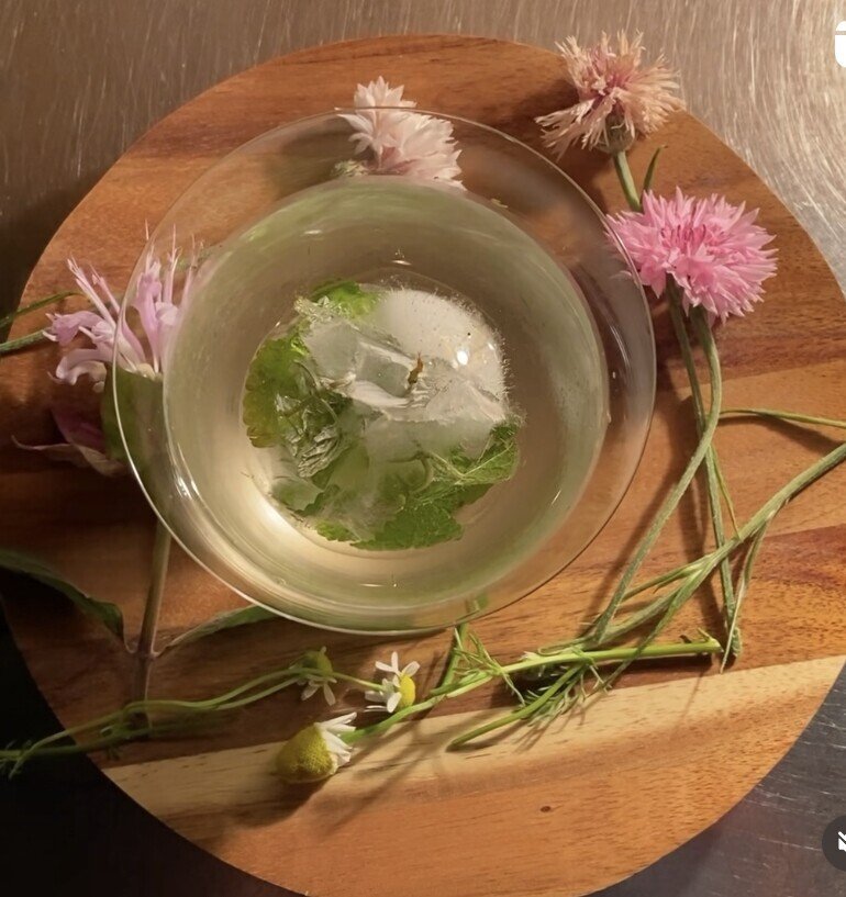 ピスコとハーブと花以前新しく出来たカクテルでピスコとハーブというのがありましてそこにお花のデコレーション 、ベルガモット、コーンフラワー、コモンマロウ、カモミール。このお花デコのカクテルなんか良いバーコントワール。