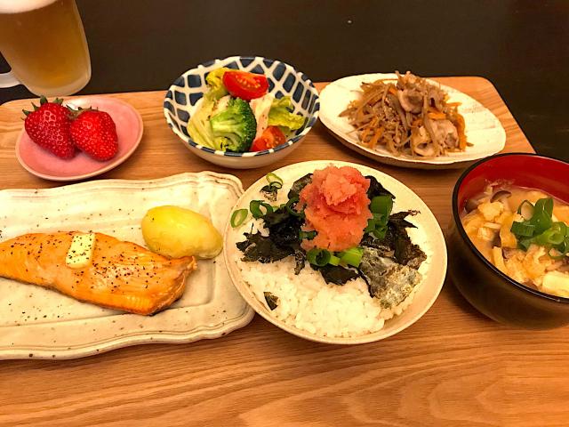 明太子ご飯 鮭のムニエルじゃがいもきんぴらごぼう味噌汁晩御飯献立 今日の料理家ご飯和食具沢山サラダ いちごSnapdish スナップディッシュID:jCSOXa。