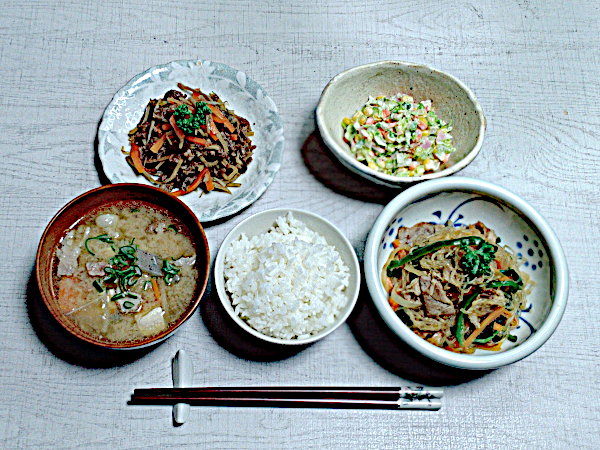豚肉とごぼうのきんぴら献立:栄養満点の晩ごはん。