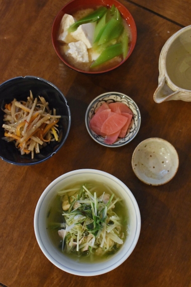 豚と水菜のはりはり煮、きんぴらごぼう献立。カリッとした毎日。