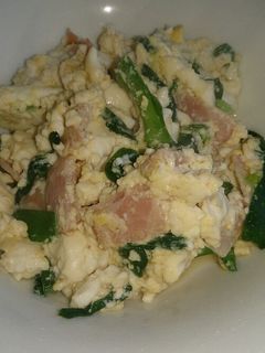 たまごとろとろ♪ 豚こま豆腐のニラ玉炒め。