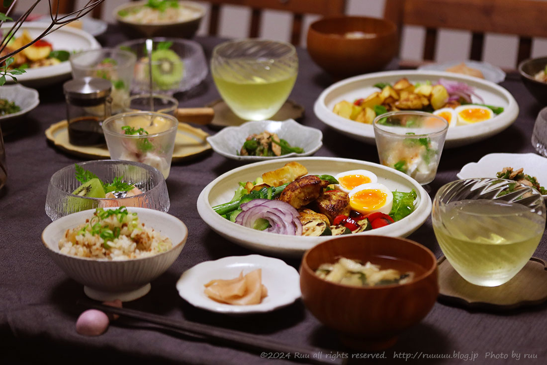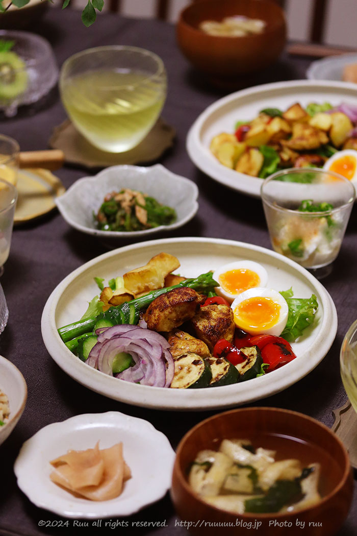 献立 タンドリーチキンとグリル野菜のごちそうサラダと、ピーマンとツナのしりしりと、鮭混ぜご飯など。~完徹に悔いなし!~ : るぅのおいしいうちごはんPowered by ライブドアブログ。