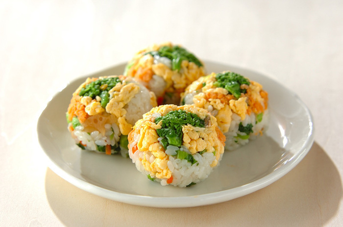 菜の花とえびの手まり寿司。