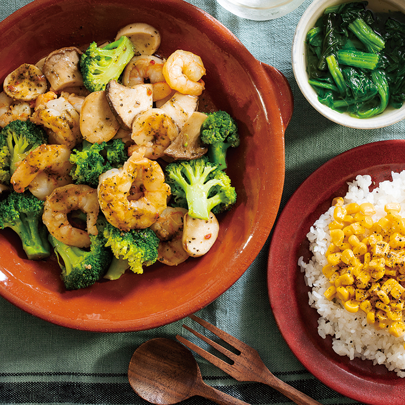 レンチンコンソメカルボの献立 副菜:ブロッコリーとエリンギのマリネ、汁物:根菜のコンソメ スープ 献立・メニュー 味の素パーク たべる楽しさを、もっと。