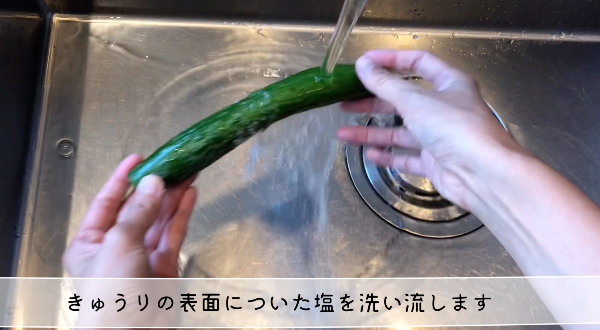 料理の基本! 洗い流すきゅうりの塩もみ。
