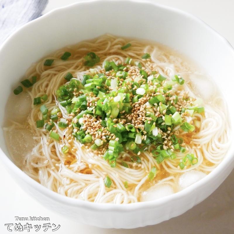リュウジ@料理のおじさんバズレシピ on X: "冷たい麺の喉ごしとゴマ油香る塩ダレのコクで一瞬にして胃袋に消えます! 『無限塩油そうめん』 白だし 小5、水大1半、砂糖小1 3、純正ごま油濃口大1、おろしにんにく半片 茹でて水で冷やし、よく水気絞った素麺100g混ぜ 小葱。