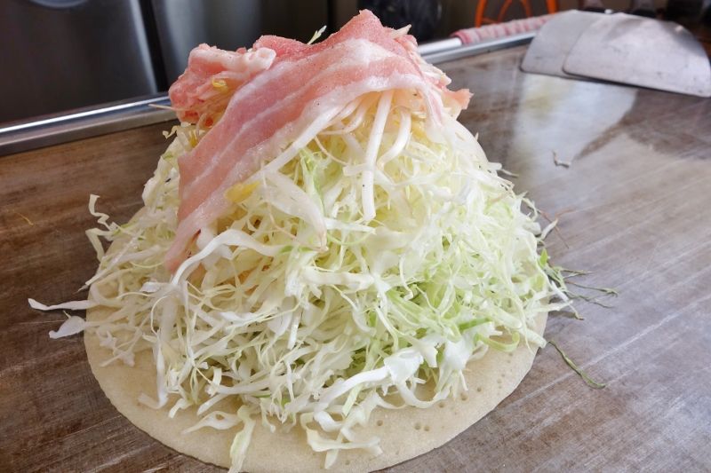 お好み焼きの作り方 レシピ その4 キャベツを載せる:広島風お好み焼き専門店『もあび』人気の美味しい広島のお好み焼き。